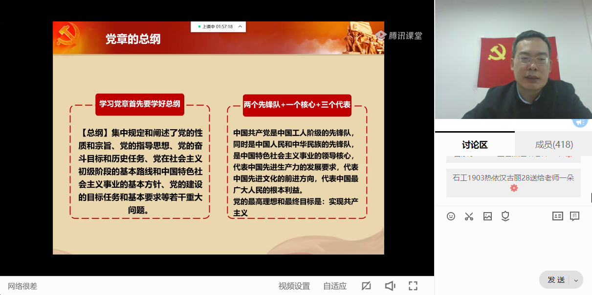 3月20日晚,石油工程學院第三十期入黨積極分子培訓班開班典禮暨第一講,以線上“云課堂”的形式成功舉辦。學院黨委副書記張建高、學生工作辦公室主任朱戰(zhàn)威及各級輔導員參加了活動。本次入黨積極分子培訓班由石油工程學院主辦,各院系400余名學生共同參加了學習。