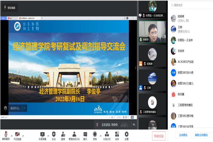 為了提升畢業(yè)生考研復(fù)試與調(diào)劑成功率,3月16日,經(jīng)濟(jì)管理學(xué)院采用騰訊會(huì)議在線上舉辦考研復(fù)試及調(diào)劑指導(dǎo)交流會(huì)。學(xué)院副院長(zhǎng)李俊亭出席會(huì)議并作考研復(fù)試調(diào)劑指導(dǎo),2018級(jí)考研學(xué)生代表50余人參加。會(huì)議由學(xué)院黨委副書(shū)記王剛主持。