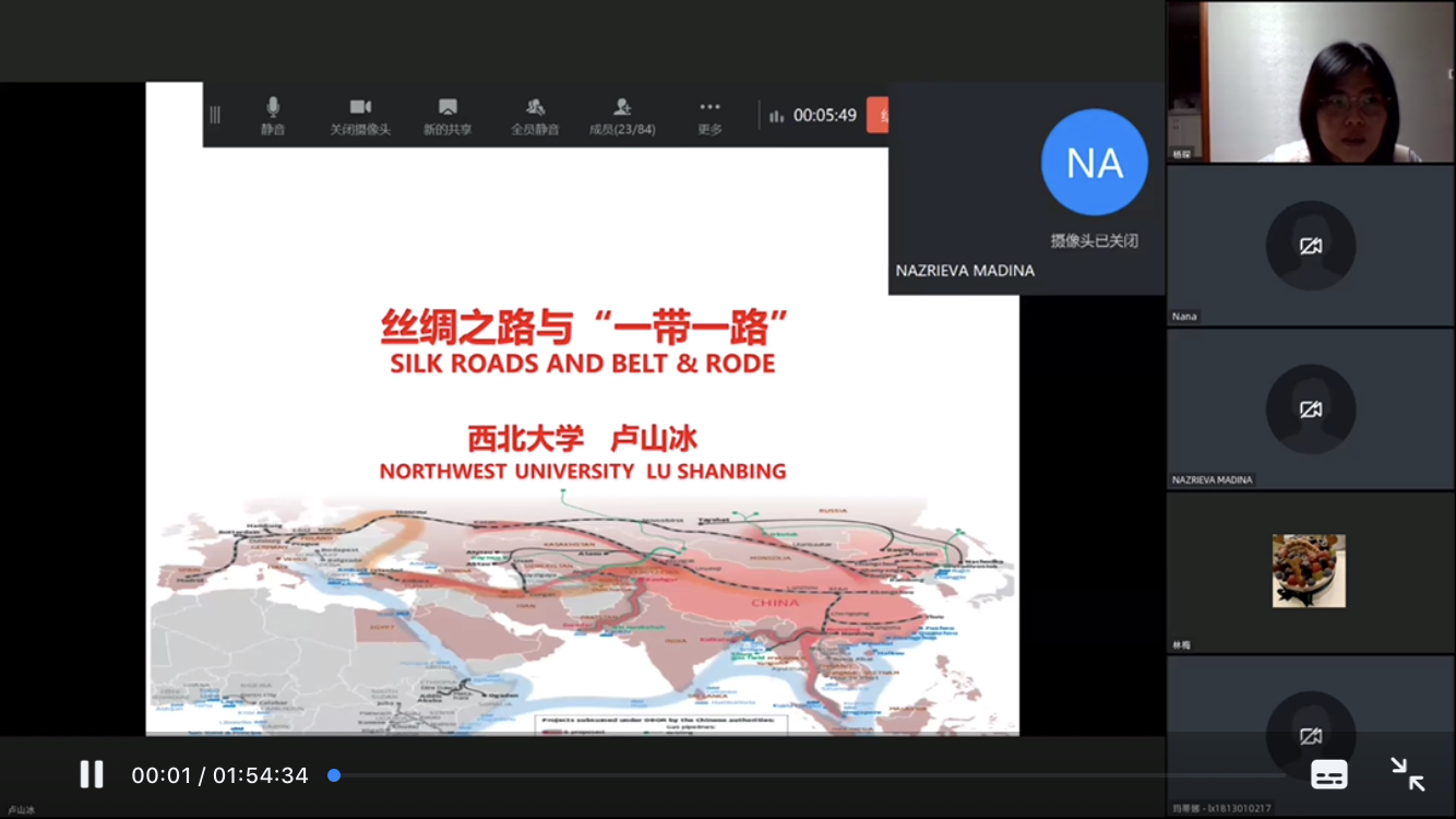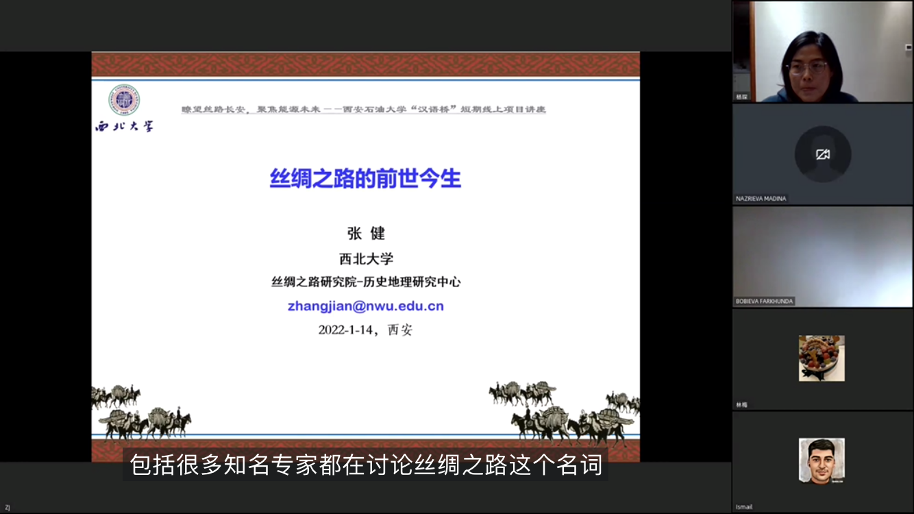 1月14日-15日,國(guó)際教育學(xué)院(絲路能源學(xué)院)特邀西北大學(xué)絲綢之路研究院院長(zhǎng)、現(xiàn)代學(xué)院院長(zhǎng)、博士生導(dǎo)師盧山冰教授及西北大學(xué)絲綢之路研究院張健副教授做了“一帶一路”線上專題講座,教育部“漢語(yǔ)橋”線上短期項(xiàng)目班學(xué)員及來(lái)自塔吉克斯坦、烏茲別克斯坦等國(guó)外合作“一帶一路”沿線國(guó)家合作單位的80名學(xué)員參加了講座,國(guó)際教育學(xué)院(絲路能源學(xué)院)相關(guān)負(fù)責(zé)人出席了講座。