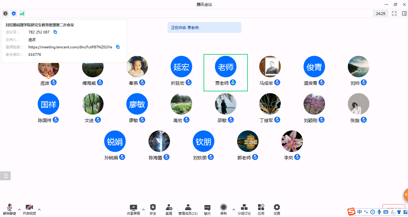 近日,按照屬地管理要求,我校雁塔校區(qū)被調整為封控區(qū)。為進一步加強學生思想引領,全面落實封控期間研究生教育管理的各項任務、明確分工,理學院先后兩次通過騰訊會議召開了研究生教育管理工作會議,全體領導班子、研究生導師、科研秘書和輔導員參加了會議,會議由理學院黨委書記廖敏主持。