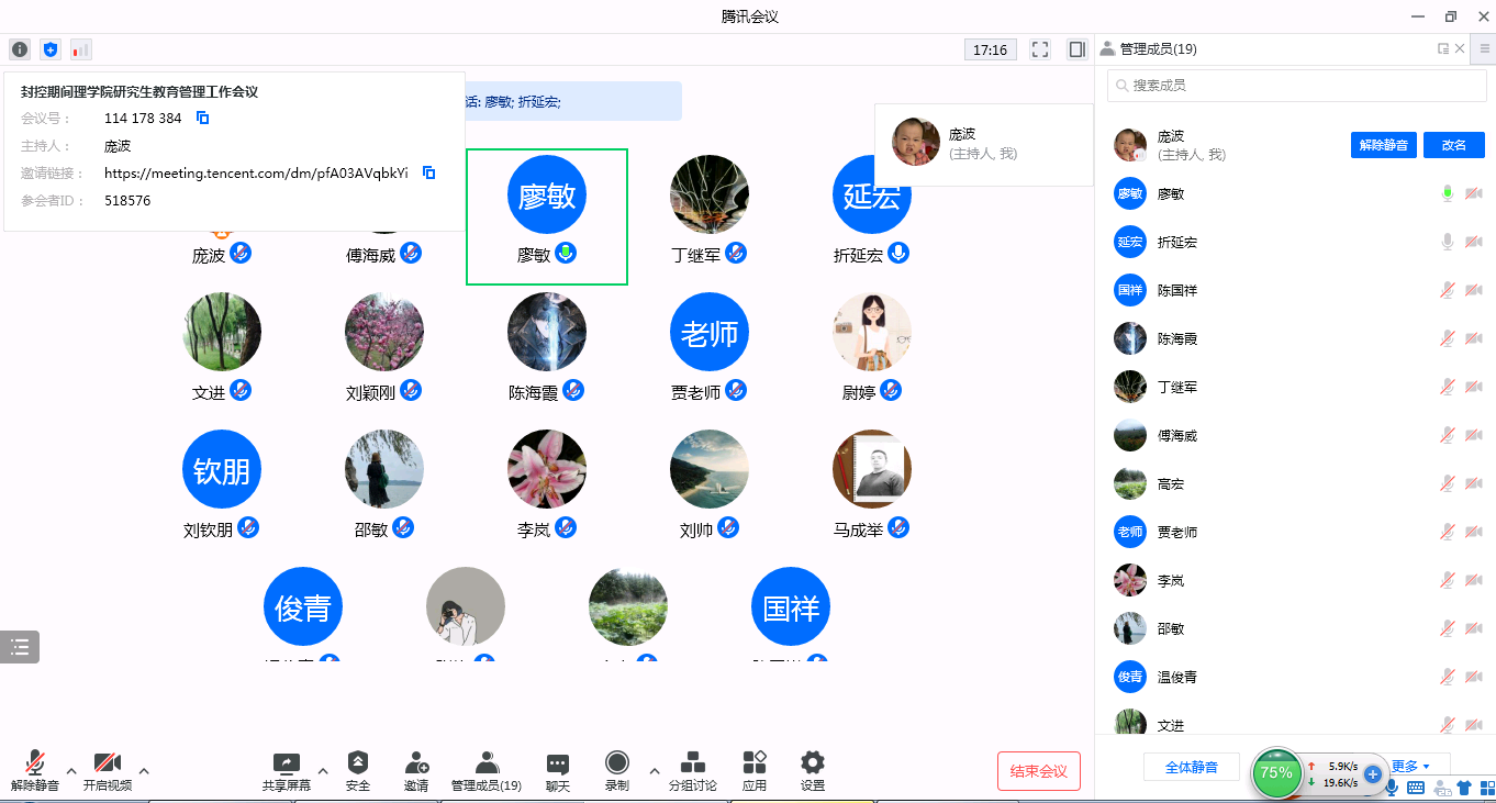 1月9日晚,理學院召開了封控期間研究生教育管理第一次工作會議。會上,學院黨政領導傳達了學校關于封控期間研究生教育管理的規(guī)定和要求,介紹了當前學院研究生教育管理工作整體情況、存在的問題和整改措施、下一步的工作打算等,并對學生思想動態(tài)摸排、學業(yè)指導、線上宿舍巡查、心理關愛、生活幫扶等方面工作進行了重點部署和要求。同時,與會人員針對學生反饋的熱點問題、關切事項進行了交流研討,共商對策。