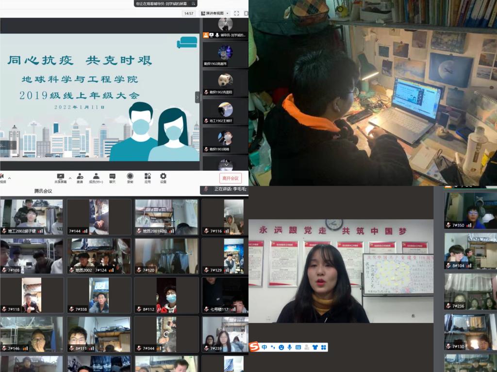 面對疫情大考,全院師生聽從指揮、服從大局,眾志成城、團(tuán)結(jié)奮斗,全力以赴筑牢校園疫情防控安全線。為進(jìn)一步落實學(xué)校疫情防控要求,加強(qiáng)學(xué)生思想建設(shè),解決學(xué)生實際困難,凝聚抗疫力量,堅定戰(zhàn)疫必勝信心,1月8日至11日,地球科學(xué)與工程學(xué)院各年級召開了線上年級大會,各年級輔導(dǎo)員及全體學(xué)生參與會議。