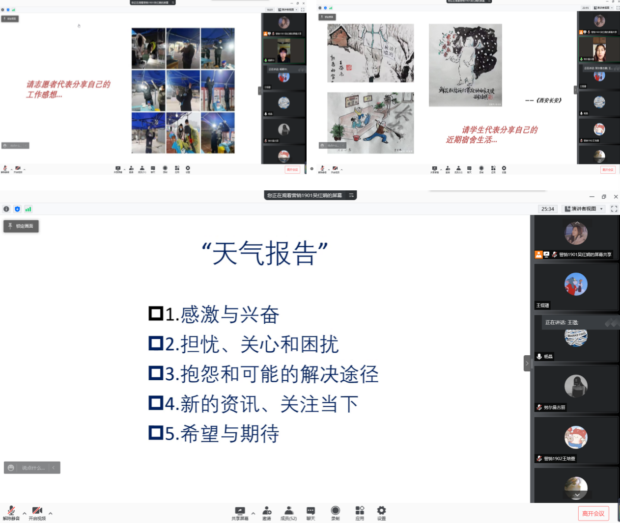 最后,由王君萍院長(zhǎng)對(duì)本次會(huì)議作總結(jié),王院長(zhǎng)建議由營(yíng)銷專業(yè)兩個(gè)班班委組織一些團(tuán)隊(duì)性活動(dòng),帶動(dòng)起大家的學(xué)習(xí)積極性,增強(qiáng)大家的集體榮譽(yù)感,幫助大家盡快明確自身定位,提前做好職業(yè)準(zhǔn)備。她倡議大家,在封控管理期間,充分利用各種渠道,例如大學(xué)慕課,bilibili等平臺(tái)開展線上學(xué)習(xí),不斷充實(shí)提升自己。王院長(zhǎng)向同學(xué)們贈(zèng)言“無(wú)論外部怎么樣變化,自身站穩(wěn)腳跟,穩(wěn)步前進(jìn)!”
