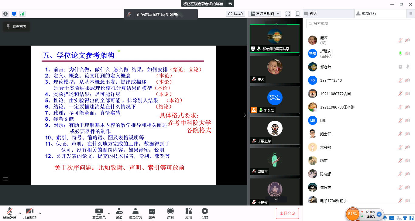 報告開始,郭教授從疫情形勢出發(fā),談及當前學習科研和論文撰寫存在的不便和困難,針對性地提出解決辦法和意見建議。接著,郭教授重點針對研究生學位論文撰寫過程中常見的問題和難題,從論文目的、構思方法、寫作模式、體現(xiàn)方式等不同側面,以要點概括與論文實例相結合的形式,兼論正文格式文體要訣,從“研究生與學術研究”“需牢記的事情”“學位論文的要求和特點”“寫學位論文的步驟”“參考結構”等7個方面詳細全面地講述了如何寫出一篇優(yōu)秀的學術論文。最后,郭教授與同學們進行了交流互動,在線解答了學生們的各類疑惑和問題。同學們興致盎然、反響熱烈。