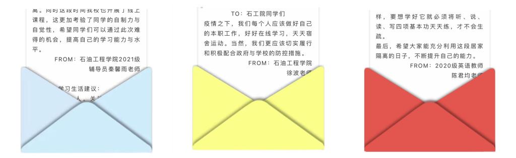 疫情就是命令、疫情就是責(zé)任!學(xué)院高度重視疫情防控期間學(xué)生的思想教育,先后開展了青春正能量、同心抗疫情主題團(tuán)日活動(dòng),組織全體班主任老師召開共克時(shí)艱、同心抗疫線上主題班會(huì),圍繞核酸檢測(cè)、防控管理要求舉行線上班會(huì),策劃實(shí)施線上運(yùn)動(dòng)會(huì)、學(xué)習(xí)風(fēng)采及優(yōu)秀筆記展示油情寄語(yǔ)、校友有話說(shuō)等線上活動(dòng),強(qiáng)化師生、校友聯(lián)系,堅(jiān)定學(xué)生戰(zhàn)疫信念,傳遞抗疫正能量。在石工青年、石工黨員e家累計(jì)發(fā)布疫情防控相關(guān)推送15篇,受到學(xué)生好評(píng)。