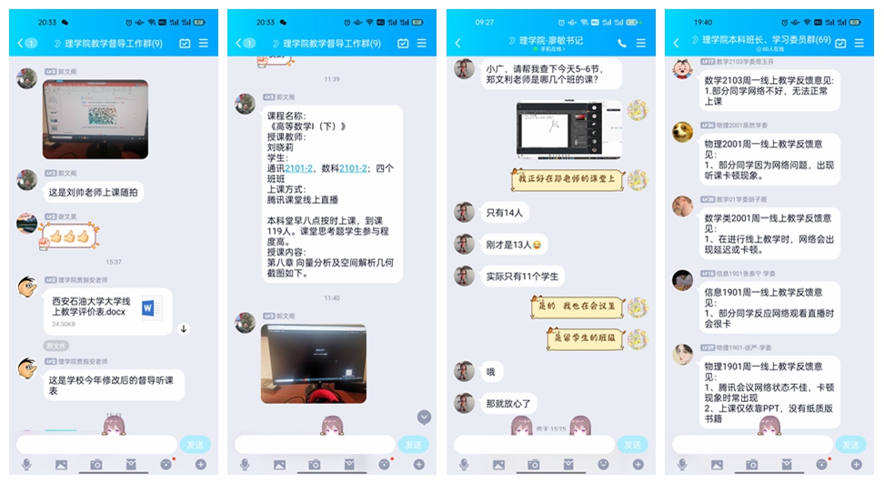 多渠道反饋,全方位總結(jié),切實(shí)保障線上教學(xué)質(zhì)量。線上授課開始前,教學(xué)辦公室提前收集匯總開學(xué)第一天的授課平臺(tái)及班級(jí)邀請(qǐng)碼,邀請(qǐng)學(xué)院領(lǐng)導(dǎo)及校、院兩級(jí)教學(xué)督導(dǎo),深入線上課堂,聽取授課情況,并實(shí)時(shí)反饋。上課結(jié)束后,及時(shí)收集各年級(jí)同學(xué)對(duì)線上授課的意見和建議,第一時(shí)間了解線上教學(xué)運(yùn)行情況,總結(jié)線上教學(xué)遇到的問題,積極與教務(wù)處溝通協(xié)調(diào),為師生營造一個(gè)良好的線上教學(xué)環(huán)境。