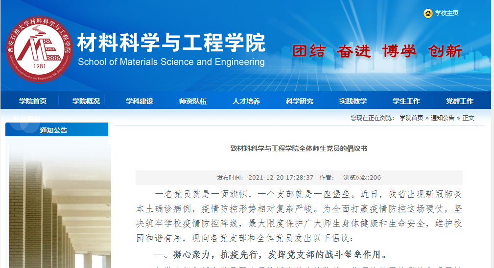 12月20日,材料科學(xué)與工程學(xué)院黨委第一時(shí)間發(fā)出《致材料科學(xué)與工程學(xué)院全體師生黨員的倡議書(shū)》,號(hào)召?gòu)V大黨員要迅速投入到疫情防控工作中來(lái),率先垂范、擔(dān)當(dāng)使命,沖在最前、干在最前,用實(shí)際行動(dòng)傳遞黨的聲音,凝聚黨的力量。在這樣的號(hào)召下,一個(gè)個(gè)材料人爭(zhēng)當(dāng)抗“疫”先鋒,用一個(gè)個(gè)弱小的力量慢慢匯聚到這場(chǎng)疫情阻擊戰(zhàn)的大戰(zhàn)役中。