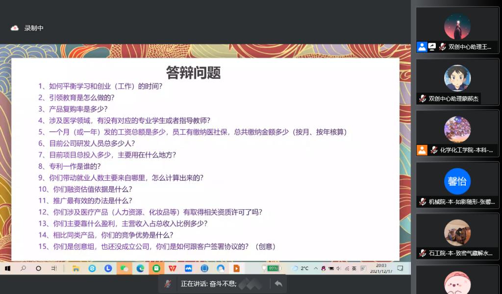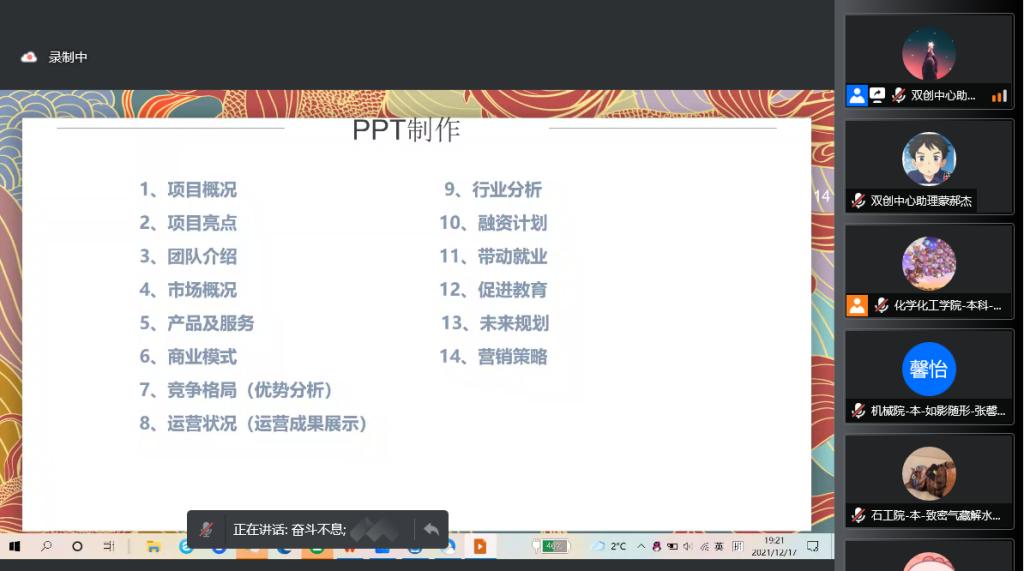 12月17日晚,由創(chuàng)新創(chuàng)業(yè)中心主辦的西安石油大學2021年大學生創(chuàng)新創(chuàng)業(yè)訓練營第八講順利開課。本次課程以《路演技巧和流程》為主題,訓練營全體學員參加了本期課程。