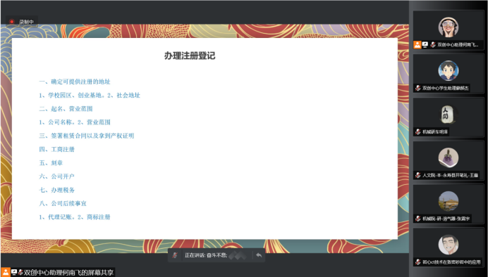 課中,劉老師對創(chuàng)業(yè)學生非常關心的“是否要注冊公司?”這一問題展開論述,建議學員們結合項目的實際情況進行選擇。對于擬注冊公司的學員,劉老師從注冊地址、公司名稱、營業(yè)范圍、產權證明、工商注冊、刻章、公司開戶、代賬公司等環(huán)節(jié)出發(fā),結合自身創(chuàng)業(yè)經歷娓娓道來。同時,推薦大學生創(chuàng)業(yè)者以“輕資產、低成本”的方式注冊公司,并在項目初始建立規(guī)章制度,明確成員分工。