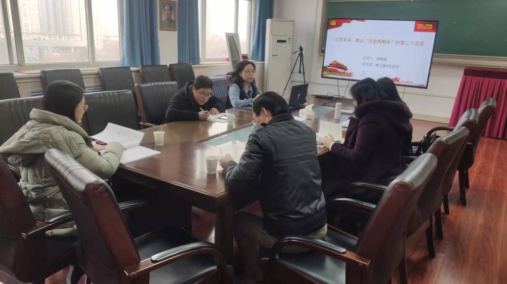 會議第一階段由黨支部書記郭艷英結(jié)合黨的十九屆六中全會精神,作了題為《自我革命:跳出“歷史周期率”的第二個答案》的黨課講授。郭老師從自我革命是黨百年奮斗的歷史經(jīng)驗、勇于自我革命是馬克思主義政黨獨有的政治品格、以新時代黨的自我革命引領(lǐng)新的偉大社會革命三個方面進行了講述。