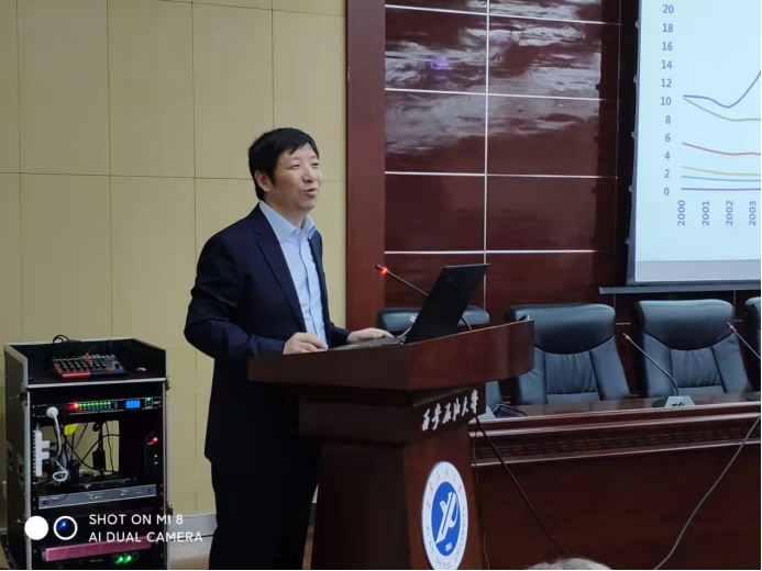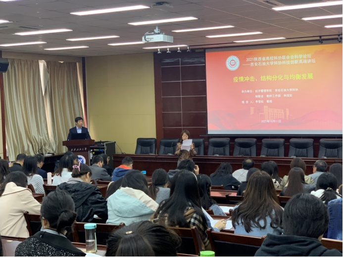 10月11日,由教師工作部、經(jīng)濟(jì)管理學(xué)院、科技處、??茀f(xié)、知聯(lián)會(huì)聯(lián)合主辦的“經(jīng)濟(jì)管理學(xué)院慶祝建校70周年系列學(xué)術(shù)報(bào)告”之《疫情沖擊、結(jié)構(gòu)分化與均衡發(fā)展》在雁塔校區(qū)第五會(huì)議室舉行。此次報(bào)告由中國(guó)社會(huì)科學(xué)院數(shù)量經(jīng)濟(jì)與技術(shù)經(jīng)濟(jì)研究所所長(zhǎng)、中國(guó)社會(huì)科學(xué)院宏觀經(jīng)濟(jì)研究智庫(kù)主任、中國(guó)社會(huì)科學(xué)院大學(xué)教授、博士生導(dǎo)師、兼中國(guó)數(shù)量經(jīng)濟(jì)學(xué)會(huì)會(huì)長(zhǎng)、工信部工業(yè)經(jīng)濟(jì)分析專(zhuān)家咨詢(xún)委員會(huì)成員李雪松主講,師生代表160余人參加報(bào)告會(huì),會(huì)議由經(jīng)濟(jì)管理學(xué)院院長(zhǎng)王君萍主持。