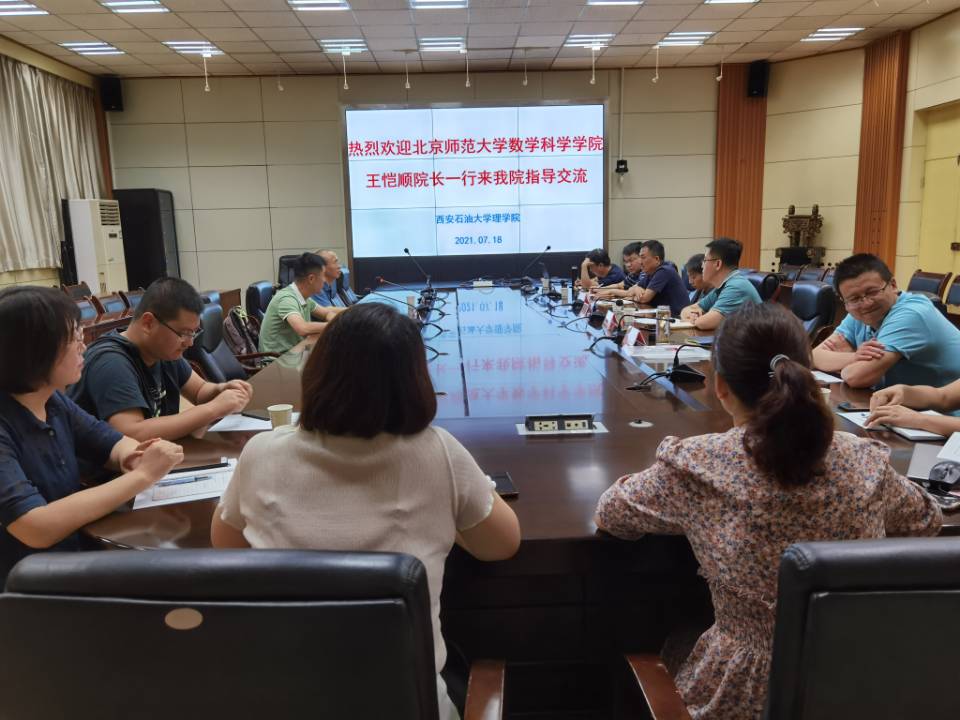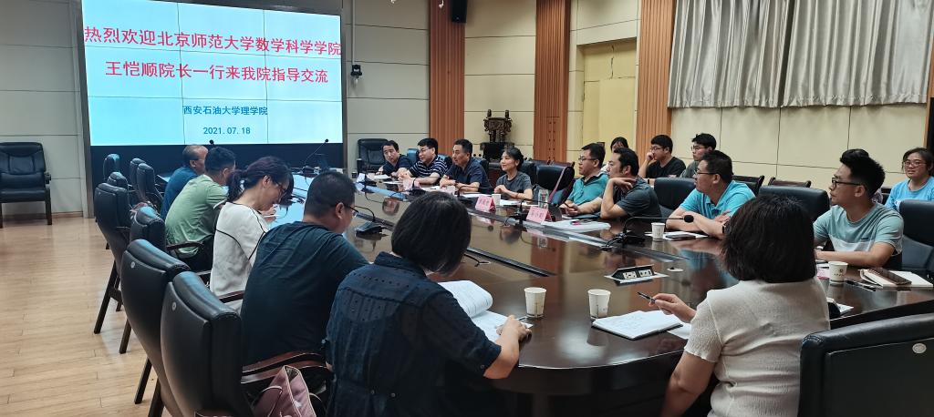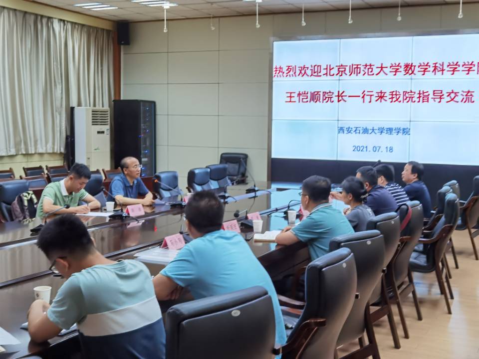 在工作交流環(huán)節(jié),傅海威院長(zhǎng)首先介紹了西安石油大學(xué)理學(xué)院的歷史沿革,學(xué)科發(fā)展現(xiàn)狀,師資隊(duì)伍建設(shè)現(xiàn)狀,學(xué)院機(jī)構(gòu)設(shè)置等情況。王愷順院長(zhǎng)詳細(xì)介紹了北京師范大學(xué)數(shù)學(xué)科學(xué)學(xué)院的發(fā)展現(xiàn)狀,本碩博招生規(guī)模,專(zhuān)業(yè)課與公共課教學(xué)情況,兩校區(qū)辦學(xué)等情況。雙方就數(shù)學(xué)學(xué)科專(zhuān)業(yè)建設(shè)、人才引進(jìn)、管理服務(wù)、教師的教學(xué)工作量等問(wèn)題進(jìn)行了深入的交流。此外,雙方還就理學(xué)院“應(yīng)用統(tǒng)計(jì)學(xué)”專(zhuān)業(yè)學(xué)位點(diǎn)建設(shè)、師資隊(duì)伍建設(shè)等難點(diǎn)問(wèn)題進(jìn)行了深入的分析、交流和探討。