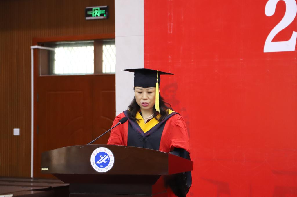在雄壯的國(guó)歌聲中,拉開了2021屆本科畢業(yè)生學(xué)位授予儀式,于艷英院長(zhǎng)代表學(xué)院致辭,為畢業(yè)生送上誠(chéng)摯祝賀與濃情寄語(yǔ)。她勉勵(lì)同學(xué)們要心存“四個(gè)感恩”:一是感恩自己,通過四年的努力奮斗和認(rèn)真學(xué)習(xí),為大學(xué)生涯畫上圓滿句號(hào),獲授文學(xué)學(xué)士學(xué)位,為自己人生征程充滿了力量和動(dòng)力;二是感恩父母,要銘記父母養(yǎng)育之恩,理解和陪伴,要傳承好孝道,在生活中用實(shí)際努力回饋父母;三是感恩學(xué)校,感恩學(xué)校老師四年的諄諄教誨,要學(xué)會(huì)尊師重道,繼續(xù)傳承和弘揚(yáng)西安石油大學(xué)辦學(xué)精神;四是感恩國(guó)家,感恩社會(huì),和諧幸福的社會(huì)讓同學(xué)們可以靜心求學(xué),增長(zhǎng)才干,要牢記責(zé)任和使命,做新中國(guó)特色社會(huì)主義合格建設(shè)者和可靠接班人,在中華民族偉大復(fù)興的事業(yè)中貢獻(xiàn)力量和成就自我。于院長(zhǎng)還對(duì)學(xué)生們提出了殷切期望,她希望學(xué)子們能夠秉承外語(yǔ)人學(xué)貫中西,積極向上的態(tài)度,牢記老師和家長(zhǎng)的重托,希望學(xué)子們用自己的專業(yè)知識(shí),為社會(huì),為國(guó)家奉獻(xiàn)自己的力量,敢于創(chuàng)新,銳意進(jìn)取,為母校爭(zhēng)光!