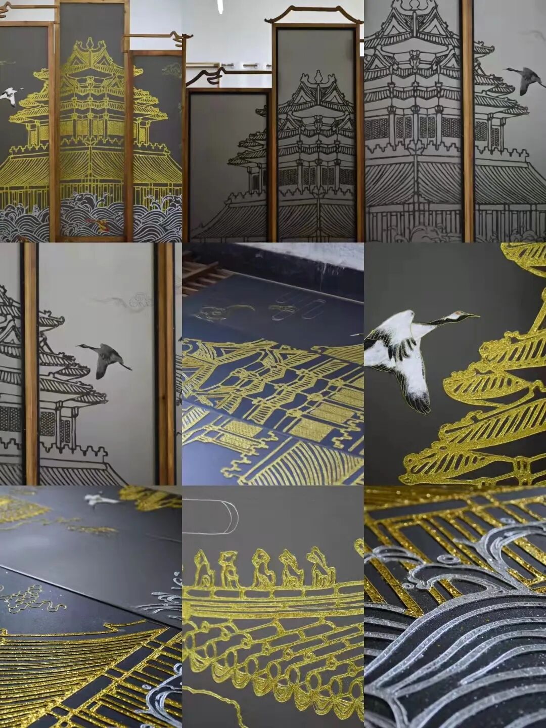 其一,大家了解的景泰藍(lán)就是銅胎掐絲琺瑯,其原理是一種在銅質(zhì)胎體上用柔軟的扁銅絲,掐成各種花紋焊上,然后把琺瑯質(zhì)的色釉填充在花紋內(nèi)燒制而成的器物。但要是以木質(zhì)家具為胎體進行掐絲琺瑯就不能進行燒制了,因而采用傳統(tǒng)熱工藝的現(xiàn)代改良法冷工藝進行嘗試,直接在已經(jīng)涂飾過的家具表面進行手工掐絲,然后填色,局部還會使用環(huán)氧樹脂膠進行表面封層,最終形成展品中不僅木質(zhì)家具表面,甚至在輕薄的屏風(fēng)上,仿佛金線纏繞實則掐絲鑲嵌,一折一直都顯得立體生動,仙鶴更是有翩翩欲飛之意。