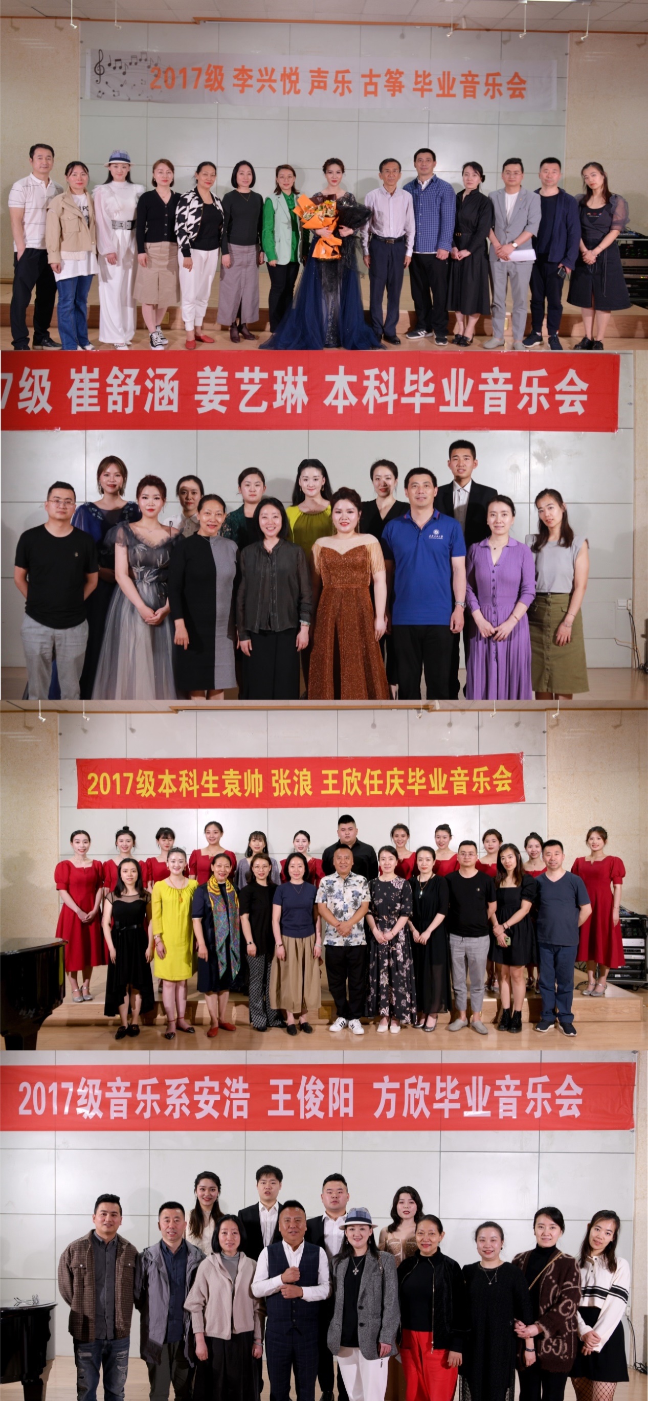 4月28至5月14日,音樂系2017屆級聲樂專修本科畢業(yè)生系列音樂會在雁塔校區(qū)第三會議室順利舉行。2017級共計15名畢業(yè)生,7位指導教師精心準備了6場高水平聲樂音樂會。學校和系領導、音樂系師生和校友以及全校聲樂愛好者共同觀看了音樂會。