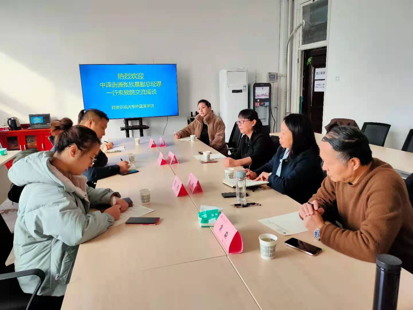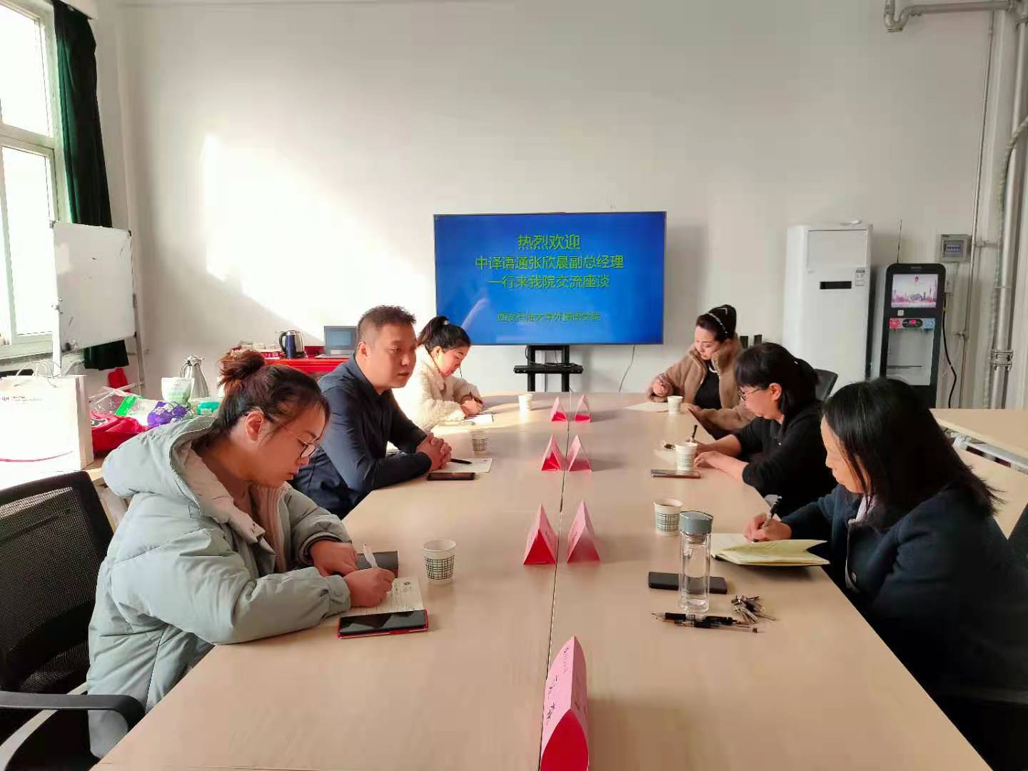 2月3日上午,中譯語通科技(陜西)有限公司副總經(jīng)理張欣晨、語言產(chǎn)品中心經(jīng)理陳棟、銷售經(jīng)理谷彩霞一行到訪外國語學(xué)院。外國語學(xué)院院長于艷英、副院長劉輝、翻譯碩士教育中心主任袁森、英語專業(yè)負(fù)責(zé)人董梅、英語系副主任鄧林參加了交流座談。