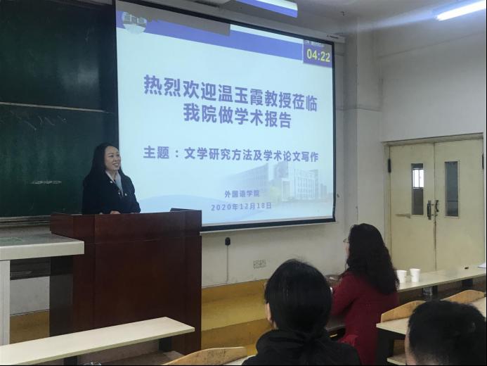 12月18日下午14:30,應(yīng)外國(guó)語學(xué)院邀請(qǐng),西安外國(guó)語大學(xué)溫玉霞教授在雁塔校區(qū)2-1102為我院師生帶來了題為“文學(xué)研究方法及學(xué)術(shù)論文寫作”的專題報(bào)告。副院長(zhǎng)劉輝、學(xué)院全體教師及研究生參加了本次學(xué)術(shù)報(bào)告會(huì),報(bào)告會(huì)由劉輝副院長(zhǎng)主持。