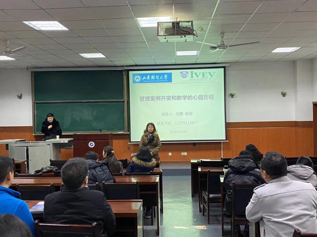 12月24日上午,山東財經(jīng)大學工商管理學院教授、加拿大西安大略大學毅偉商學院兼職教授、魯商案例研發(fā)中心主任劉素教授在2號教學樓東階201教室作了題為《管理案例開發(fā)和教學的心路歷程》的學術報告。主管研究生教學工作的李俊亭副院長主持了報告會,王君萍院長和經(jīng)濟管理學院專業(yè)碩士指導教師等近30人參加。