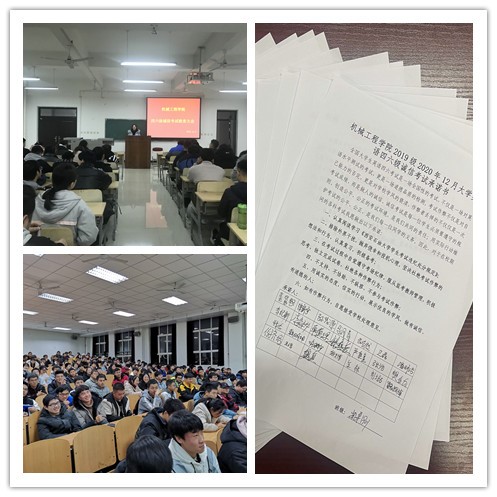 127-9日,機(jī)械工程學(xué)院分年級、分批次召開英語四六級考試誠信教育大會,各年級輔導(dǎo)員老師主持會議,大會分別做考前動員和誠信教育。