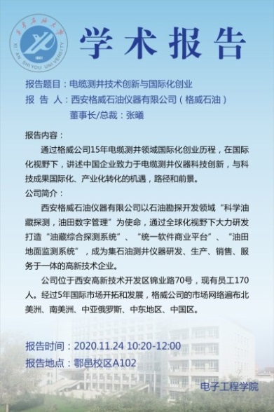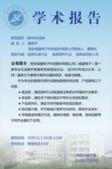 近期,為了幫助學(xué)生更好的了解專(zhuān)業(yè),明確學(xué)習(xí)目標(biāo),激發(fā)學(xué)習(xí)興趣,電子工程學(xué)院周靜教授在測(cè)控技術(shù)與儀器專(zhuān)業(yè)的《新生研討課》中,積極進(jìn)行教學(xué)改革,邀請(qǐng)了西安威盛電子科技股份有限公司創(chuàng)始人詹保平、北京六合偉業(yè)科技股份有限公司創(chuàng)始人馮建宇、西安格威石油儀器有限公司董事長(zhǎng)張曦三位企業(yè)家走進(jìn)課堂,給大一新生帶來(lái)了三場(chǎng)精彩的報(bào)告。報(bào)告從石油行業(yè)的發(fā)展、國(guó)內(nèi)外形勢(shì)、前言技術(shù)出發(fā),結(jié)合自身創(chuàng)業(yè)歷程,講述了在目前的形勢(shì)下,企業(yè)面臨的機(jī)遇與挑戰(zhàn),引導(dǎo)學(xué)生建立創(chuàng)新創(chuàng)業(yè)的意識(shí)。