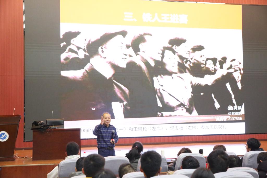 郭崗彥主任長期致力于大慶精神、鐵人精神的學(xué)習(xí)和研究,對鐵人王進喜的生平事跡和鐵人精神有著獨特的見解。此次報告會,郭主任從鐵人精神的歷史地位,鐵人精神產(chǎn)生的時代背景和鐵人精神帶給我們的啟示三個方面闡釋了鐵人精神的內(nèi)涵。首先,郭主任通過對王進喜生平的講解以及他對中國石油工業(yè)發(fā)展的突出貢獻的描述,強調(diào)了王進喜民族英雄的歷史地位。隨后,郭主任回顧了上世紀六七十年代中國缺油少油的歷史背景,在中國石油極度匱乏的情況下,王進喜及所有參加大慶“石油大會戰(zhàn)”的全體石油工人用“人拉肩扛”“盆端桶提”的方式,為中國摘掉了“貧油”的帽子。最后,郭主任強調(diào),作為當代大學(xué)生,應(yīng)該學(xué)習(xí)王進喜“寧可少活二十年,拼命也要拿下大油田”的拼搏精神,堅定理想信念,明確學(xué)習(xí)目標,努力將自己培養(yǎng)成德智體美勞全面發(fā)展的社會主義建設(shè)者和接班人,為實現(xiàn)中華民族的偉大復(fù)興貢獻自己的力量。