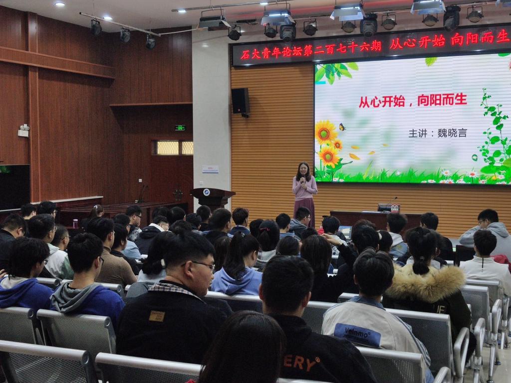 20201112日下午,由西安石油大學(xué)團(tuán)委主辦,地球科學(xué)與工程學(xué)院承辦的第276期石大青年論壇:從心開始,向陽(yáng)而生,在鄠邑校區(qū)就業(yè)多功能廳順利舉辦。此次論壇主講老師是學(xué)生心理成長(zhǎng)指導(dǎo)中心魏曉言老師。