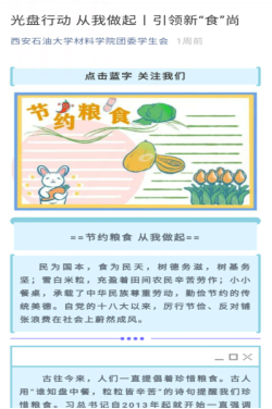 圍繞“拒絕餐飲浪費(fèi)”主題,材料科學(xué)與工程學(xué)院在微信公眾平臺(tái)、QQ群等進(jìn)行宣傳,并發(fā)出倡議。在全體學(xué)生中營(yíng)造厲行節(jié)約、反對(duì)浪費(fèi)、崇尚節(jié)儉的良好氛圍,樹(shù)立“一粥一飯當(dāng)思來(lái)之不易,半絲半縷恒念物力維艱”的勤儉節(jié)約意識(shí)。