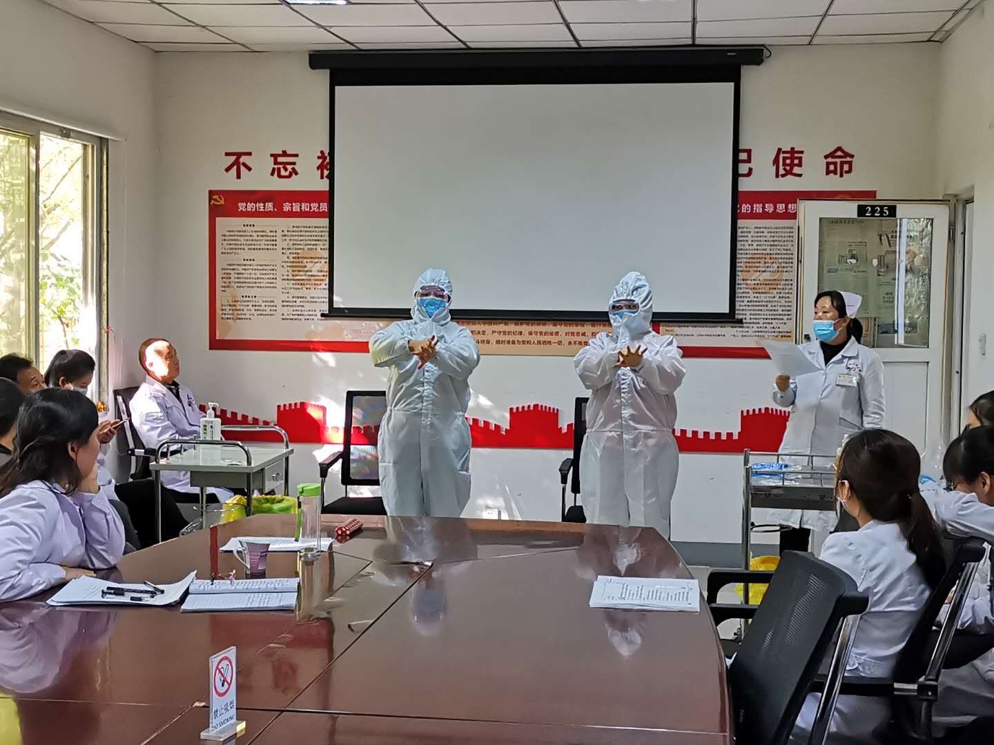 三、進(jìn)行穿脫防護(hù)服演示及練習(xí),由茹萍護(hù)士長(zhǎng)負(fù)責(zé)講解,兩名工作人員示范手衛(wèi)生和穿脫防護(hù)服的方法演示并手把手指導(dǎo)大家再次進(jìn)行練習(xí),通過(guò)練習(xí)和現(xiàn)場(chǎng)考核,大家能夠熟練掌握穿脫隔離衣的技術(shù),培訓(xùn)得到較好的效果。