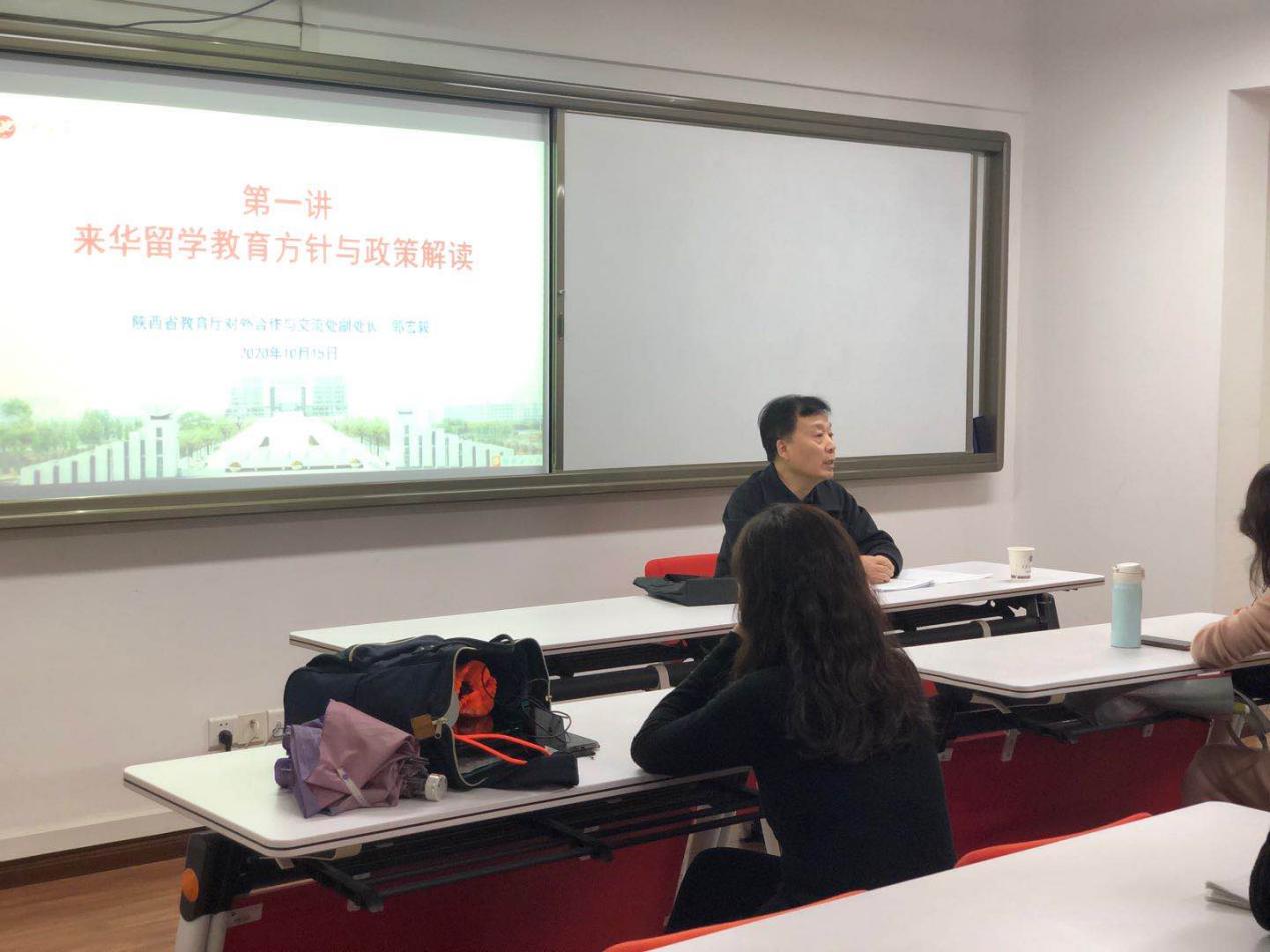 郭宏毅副處長以“來華留學(xué)教育方針與政策解讀”為題,從我國來華留學(xué)生發(fā)展過程及陜西省來華留學(xué)生發(fā)展現(xiàn)狀、陜西省來華留學(xué)生管理工作及取得的成績、留管干部工作建議及要求、今后來華留學(xué)生發(fā)展工作重點四個方面為主題,深入淺出,系統(tǒng)講解了來華留學(xué)生管理工作中的各項政策。此外,郭宏毅副處長結(jié)合實際案例,重點講解了突發(fā)事件處理、輿情管理、來華留學(xué)簽證審批表(JW202表)管理、如何實現(xiàn)提質(zhì)增效等管理過程中的突出問題。