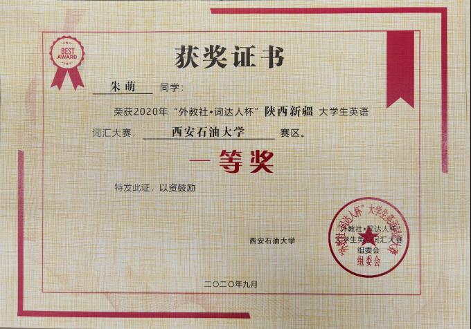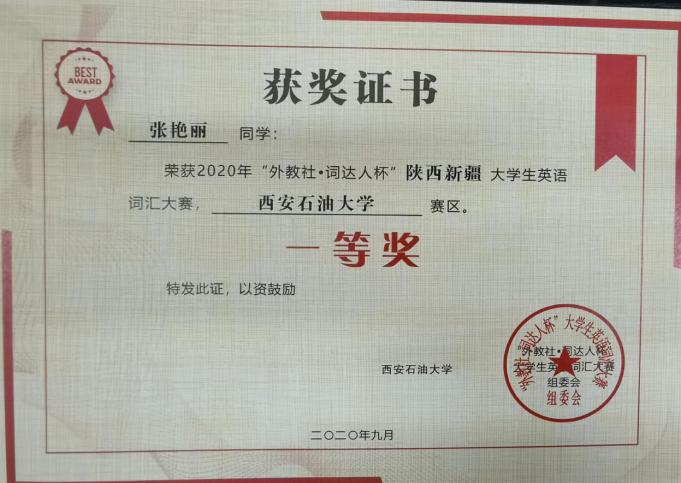 此次大賽采用全線上競(jìng)賽模式,設(shè)置多種詞匯題型,隨機(jī)出題,綜合學(xué)生答題分?jǐn)?shù)和答題時(shí)間進(jìn)行排名。此次大賽我校共143名學(xué)生參加比賽,評(píng)選出一等獎(jiǎng)20名,二等獎(jiǎng)18名.
