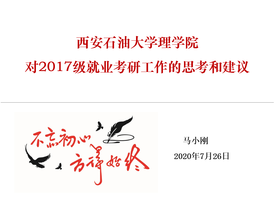 為切實抓住暑期備考黃金時期,有效增強學(xué)生考研信心,大力激發(fā)學(xué)生考研斗志,7月26日下午,理學(xué)院黨委副書記馬小剛、學(xué)生管理辦公室主任丁亦喆、輔導(dǎo)員康偉一行三人到鄠邑校區(qū)看望慰問暑期留??佳械?1名學(xué)子,馬小剛書記為全體留校同學(xué)作“不忘初心、方得始終——對2017級學(xué)生就業(yè)考研工作的思考和建議”專題講座。