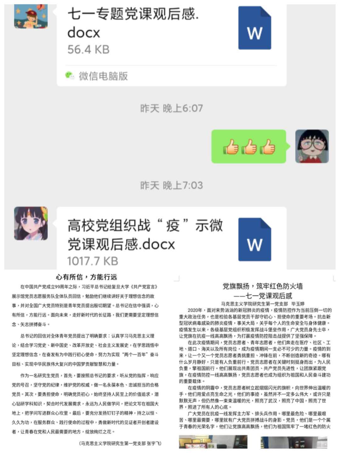 為慶祝中國(guó)共產(chǎn)黨建黨99周年,71日上午9點(diǎn),由教育部思政司指導(dǎo)的高校黨組織戰(zhàn)“疫”示范微黨課“七一”專題在線上開播,馬克思主義學(xué)院黨總支、各黨支部組織全體師生黨員通過(guò)線上、線下等多種方式及時(shí)收看。學(xué)院黨總支委員、教師黨員代表、畢業(yè)生黨員代表,在黨員活動(dòng)室集中收看了此次黨課直播。