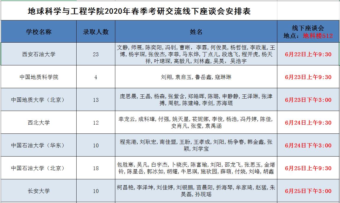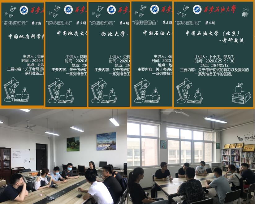 2020年6月22日——25日,地球科學(xué)與工程學(xué)院針對2017級考研學(xué)生,分西安石油大學(xué)、中國地質(zhì)科學(xué)院、中國地質(zhì)大學(xué)(北京)、西北大學(xué)、中國石油大學(xué)(華東)、中國石油大學(xué)(北京)、長安大學(xué)等七所目標(biāo)院校,邀請2016級考研成功的同學(xué)分享經(jīng)驗(yàn),一共舉辦七場考研交流活動(dòng)。