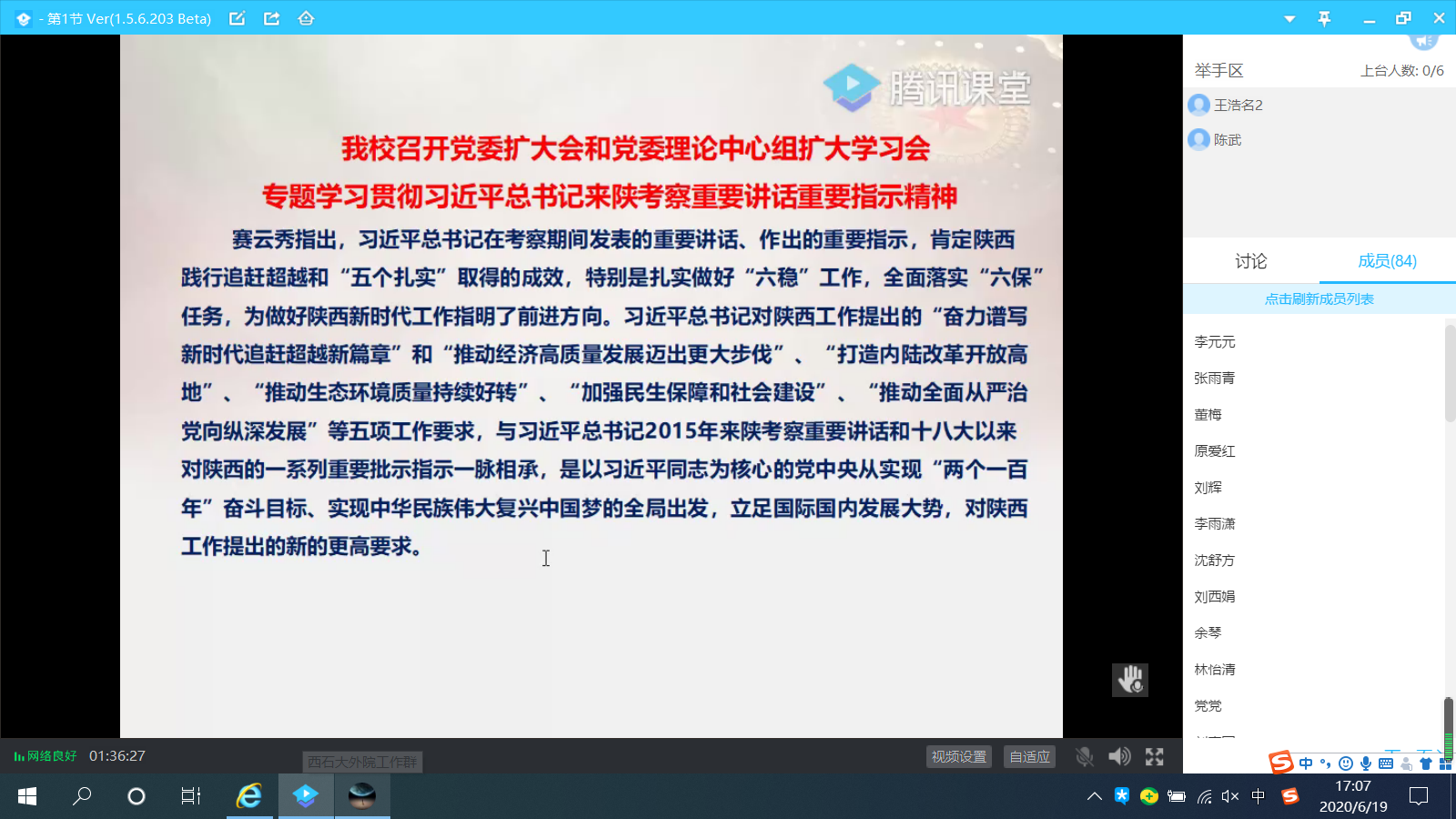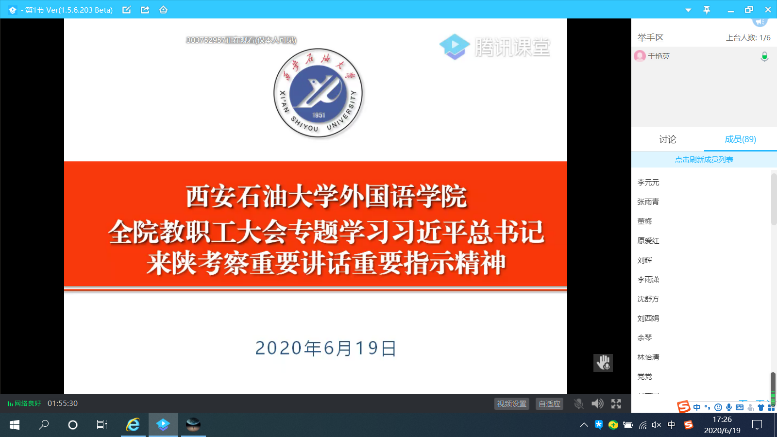 6月19日下午,外國語學(xué)院通過騰訊課堂的方式召開全院教職工大會,專題學(xué)習(xí)習(xí)近平總書記來陜考察重要講話精神。全院教職工參加會議,會議由學(xué)院黨委書記蔡強(qiáng)主持。
