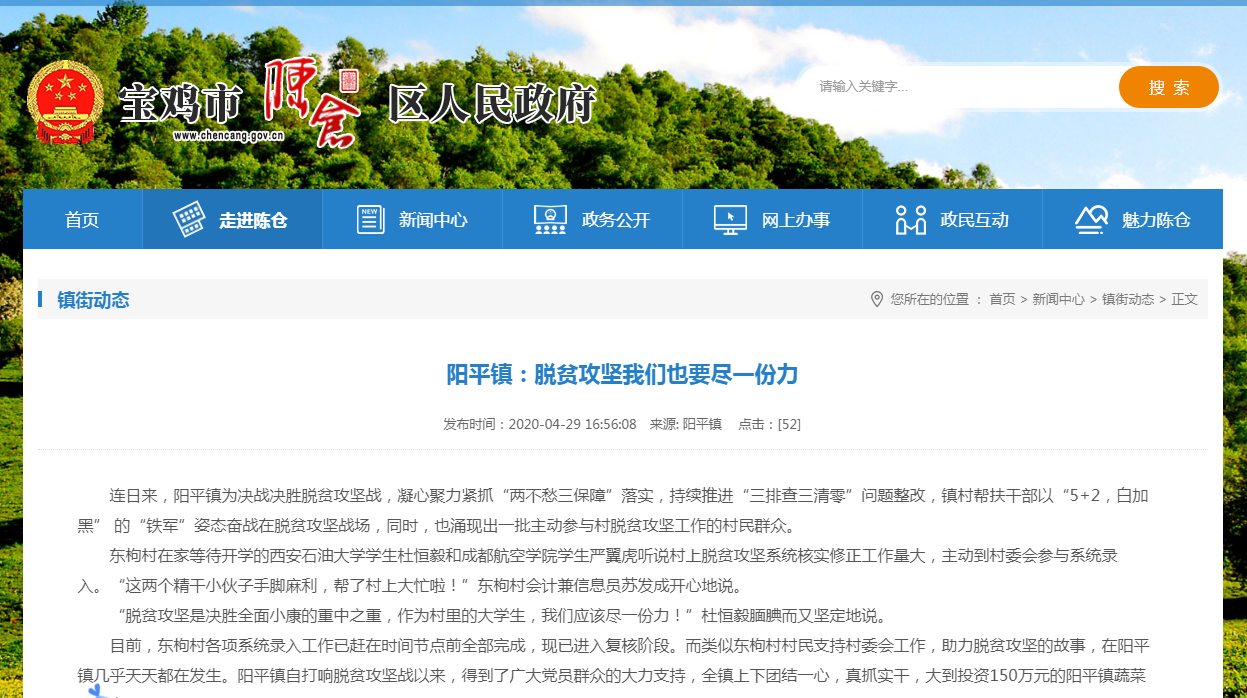 2020年是全國(guó)脫貧攻堅(jiān)決戰(zhàn)決勝之年,我們將全面建成小康社會(huì),實(shí)現(xiàn)第一個(gè)百年奮斗目標(biāo)。在脫貧攻堅(jiān)全面收官的關(guān)鍵階段,石油工程學(xué)院2017級(jí)杜恒毅同學(xué),因積極志愿參與當(dāng)?shù)孛撠毠?jiān)工作,近日受到寶雞市陳倉(cāng)區(qū)政府和《陽(yáng)光報(bào)》報(bào)道宣傳,該區(qū)人民政府特致電我校,對(duì)該生進(jìn)行表?yè)P(yáng)。