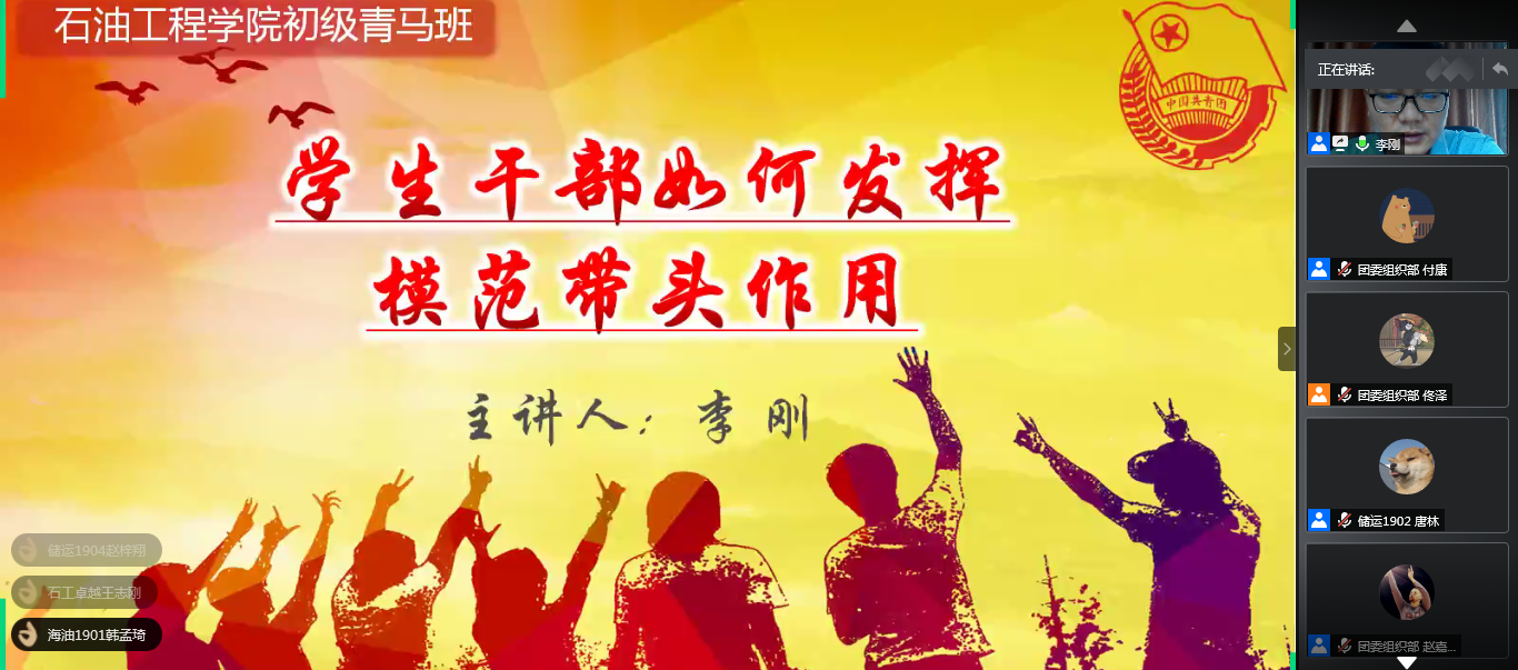 為進一步提升學生干部的工作能力,強化班級建設(shè),5月22日下午石油工程學院第八期初級青馬班第三講順利開展。我院2019級輔導員李剛老師為全體參訓學員作了題為“學生干部如何發(fā)揮模范帶頭作用”的線上培訓,2019級全體學生干部參加了此次培訓活動。