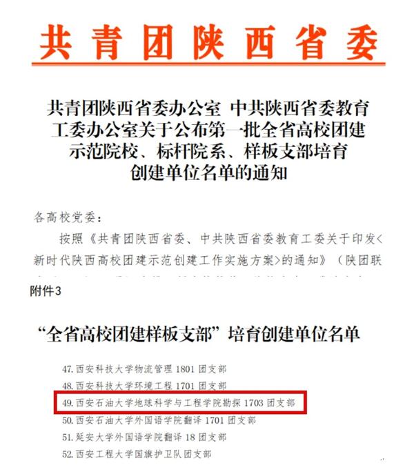 近日,經(jīng)校團委推薦,共青團陜西省委辦公室、中共陜西省委教育工委辦公室聯(lián)合公布了“第一批全省高校示范院校、標桿院系、樣板支部培育創(chuàng)建單位名單”。地球科學與工程學院勘探1703團支部獲批“陜西省高校團建樣板團支部”培育創(chuàng)建單位。