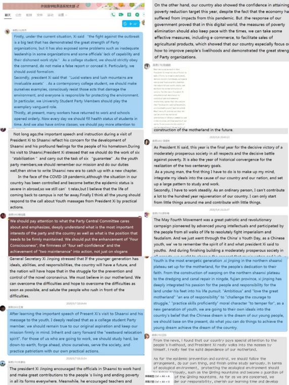 2017級黨員齊澤芃說:“President Xi  came to Shaanxi province to instruct officials to overcome the impact of the novel corona virus outbreak and fulfill this year's poverty eradication goal during an inspection tour, actually I have lots of words and feelings after what China and the world have gone through or have been going through until now, I really think we Chinese people are the most disciplined nation in the world, which helped us overcome the epidemic quickly. Compared to other countries, we can see they are still in a complete mess, and many countries turn to China.