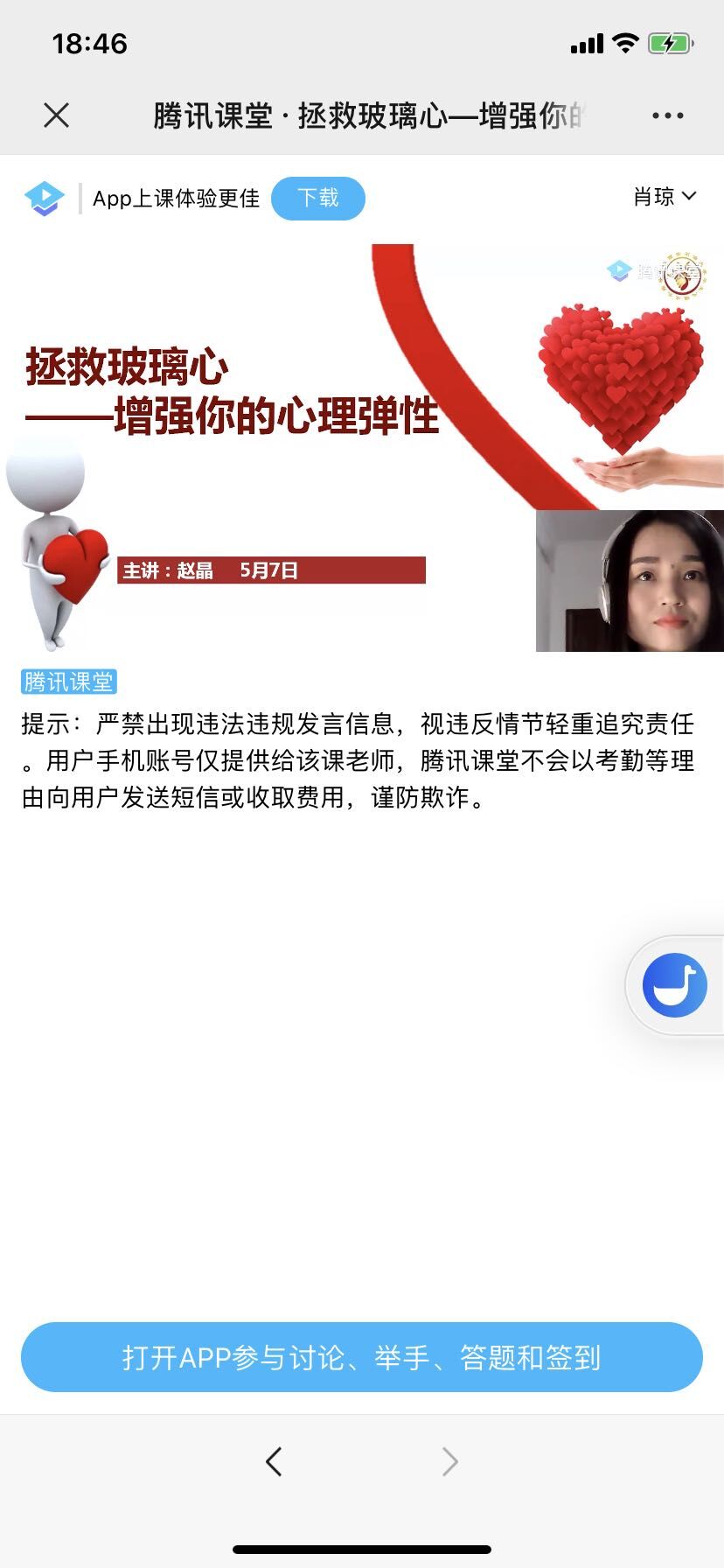 5月7日晚,學(xué)生心理成長指導(dǎo)中心教師趙晶老師在騰訊課堂做了《拯救玻璃心——增強(qiáng)你的心理彈性》專題講座,這是“危機(jī)中成長—‘后新冠’時(shí)期心理健康教育”系列講座第四講,我校部分教師、后勤樓管、研究生、留學(xué)生及全校心理委員近700人在線觀看學(xué)習(xí)。
