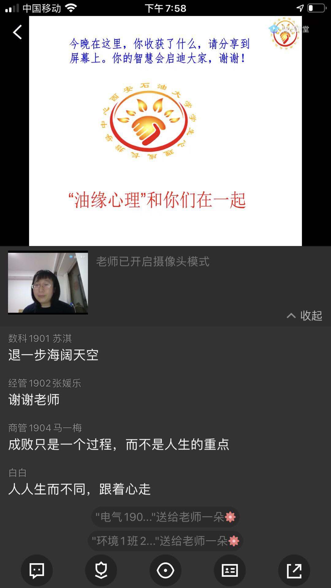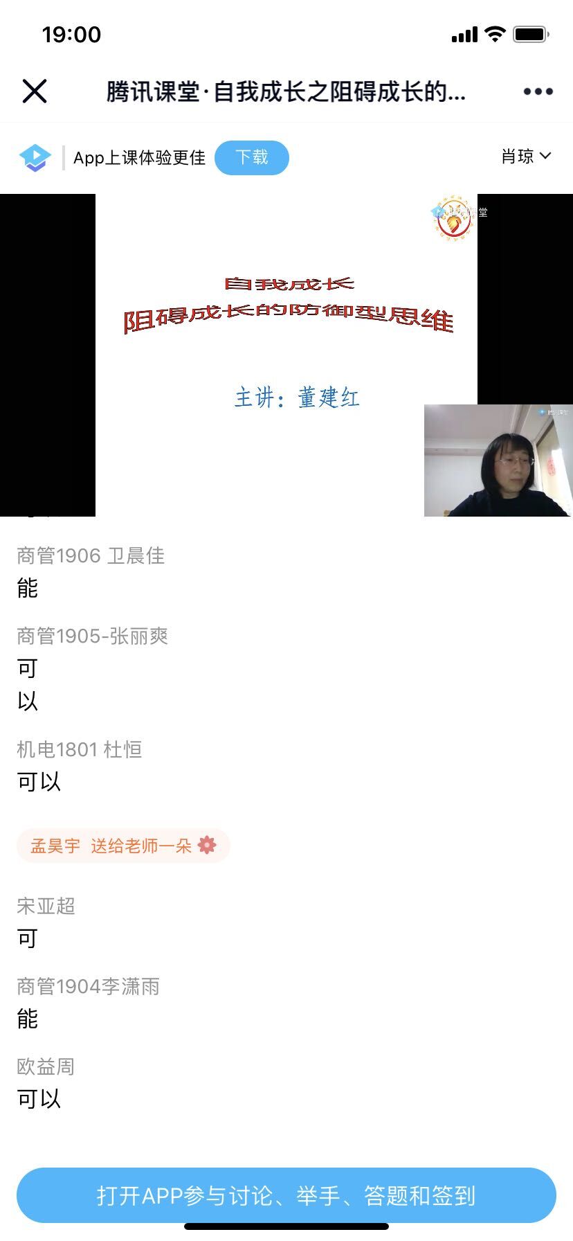 為繼續(xù)完善和加強(qiáng)我校師生在疫情期間的心理健康教育,429日晚,我校學(xué)生心理成長(zhǎng)指導(dǎo)中心教師董建紅老師在騰訊課堂進(jìn)行了《自我成長(zhǎng)之阻礙成長(zhǎng)的防御型思維》專題講座,我校部分師生、后勤樓管人員、全校心理委員近600人在線觀看學(xué)習(xí)。