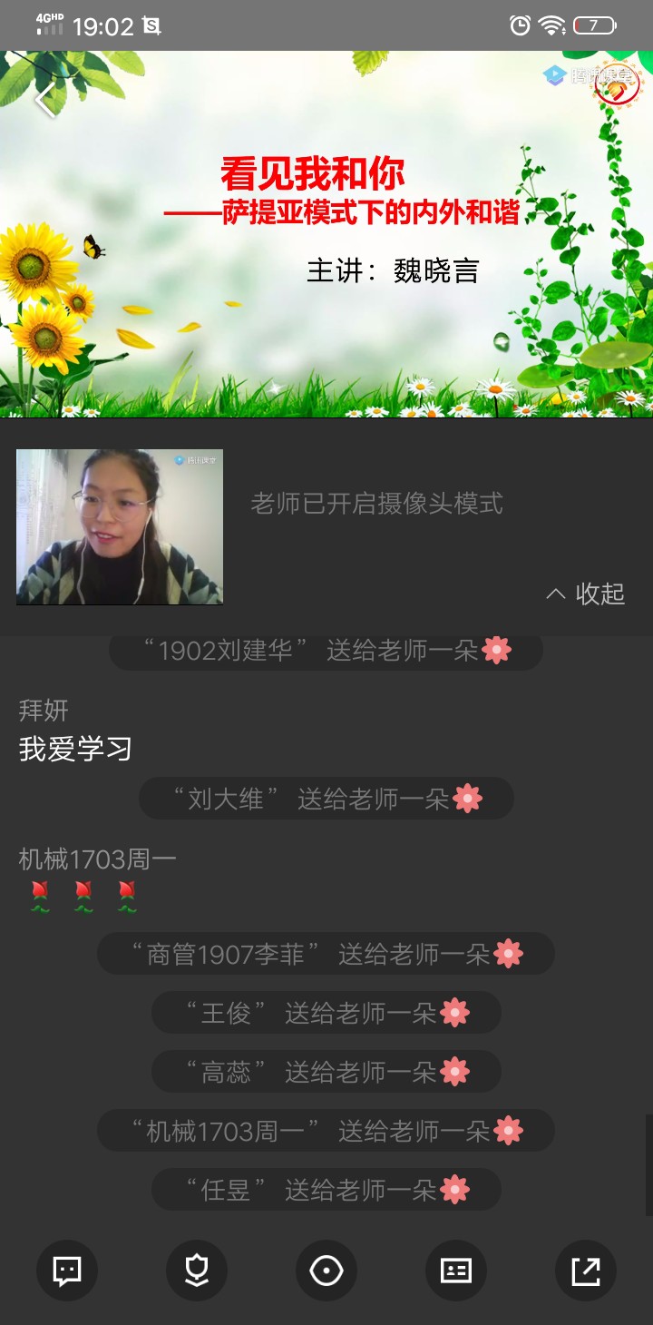 為進(jìn)一步加強(qiáng)疫情期間師生的心理健康教育,4月23日晚,我校學(xué)生心理成長(zhǎng)指導(dǎo)中心教師魏曉言老師在騰訊課堂進(jìn)行了《看見我和你-薩提亞模式下的內(nèi)外和諧》專題講座,我校部分師生、全校心理委員近700人在線觀看學(xué)習(xí)。