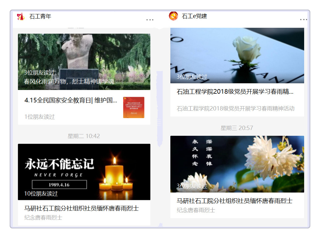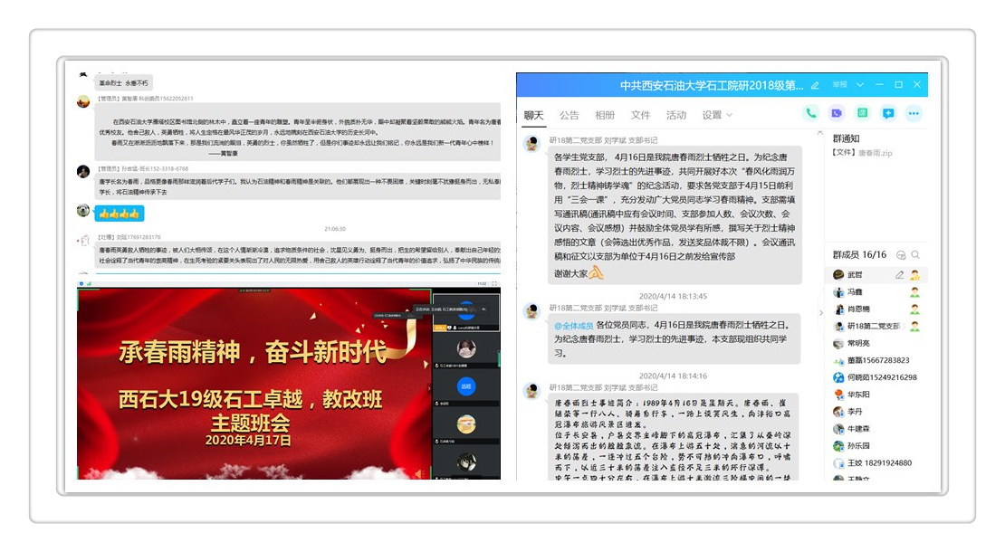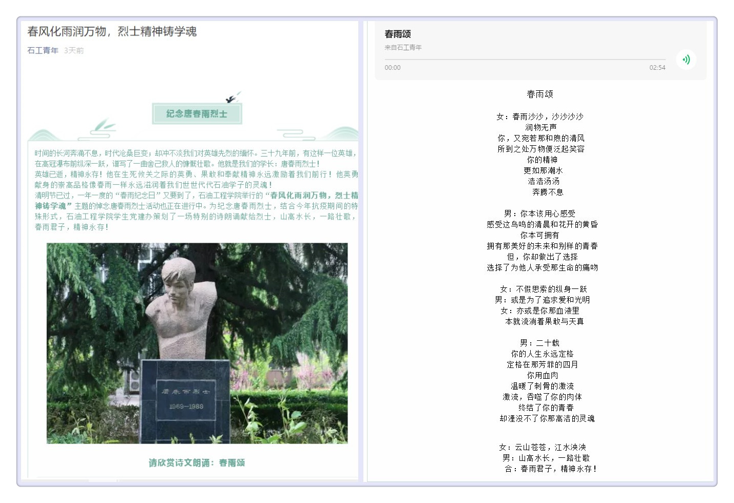 正直疫情防控期間,學(xué)生們無法來到現(xiàn)場緬懷烈士。為表示對唐春雨同志的追思,鼓勵(lì)更多青年學(xué)生了解和學(xué)習(xí)傳承“春雨精,學(xué)院于4月初開始,開展了線上系列紀(jì)念活動(dòng)。各學(xué)生黨支部積極開展以學(xué)習(xí)“春雨精為主題的“三會(huì)一課”活動(dòng);馬克思主義研習(xí)社石油工程學(xué)院分社就緬懷唐春雨烈士、學(xué)習(xí)“春雨精舉辦了線上專題研討會(huì);各團(tuán)支部也分別召開了學(xué)習(xí)唐春雨烈士事跡和“春雨精神”的主題團(tuán)會(huì);2018級(jí)和2019級(jí)本科生還聯(lián)合制作了配樂詩朗誦《春雨頌》紀(jì)念烈士。同時(shí),石油工程學(xué)院還積極向全體學(xué)生征集學(xué)習(xí)“春雨精感悟的文章,并利用石工青年等媒體平臺(tái)積極宣傳分享,諸多線上活動(dòng)取得良好成效。