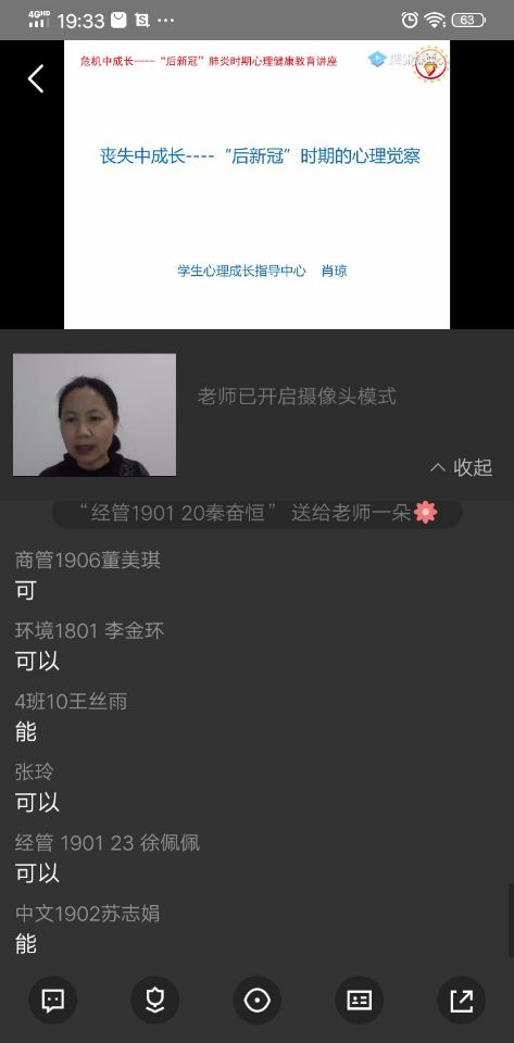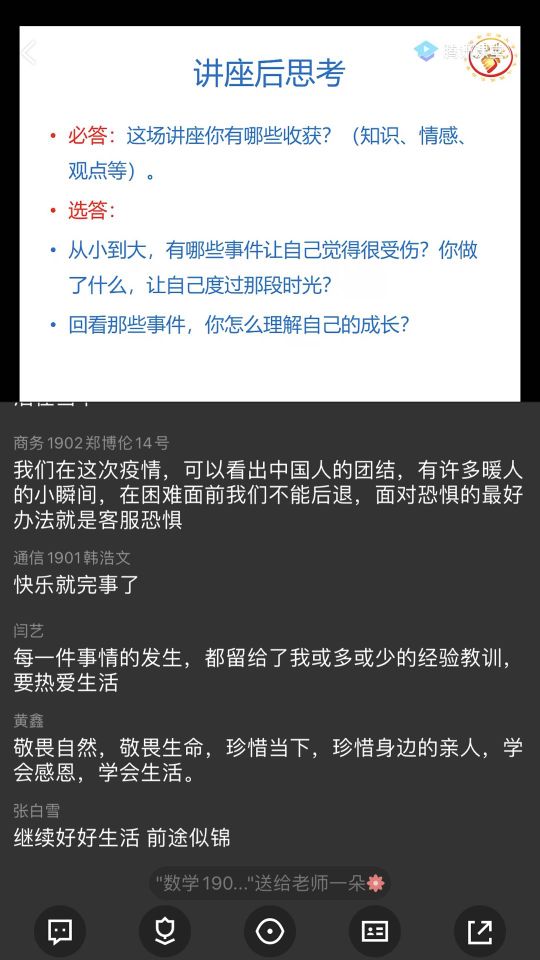 肖老師講到,新冠肺炎嚴(yán)重暴發(fā)期間,人們的注意力在疾病本身,而“后新冠”肺炎時(shí)期的當(dāng)下,人們更關(guān)注新冠肺炎造成的影響,尤其是心理影響。她以“新冠肺炎”疫情中的喪失為切入點(diǎn),讓同學(xué)們回顧疫情期間的情感、行為及關(guān)系,體會(huì)在疫情期間喪失了什么,又引導(dǎo)同學(xué)們辯證地思考喪失中是否只有失去,在學(xué)生們總結(jié)出抗“疫”期間的收獲后,啟發(fā)同學(xué)們覺(jué)察新冠肺炎疫情帶給自己的成長(zhǎng)。