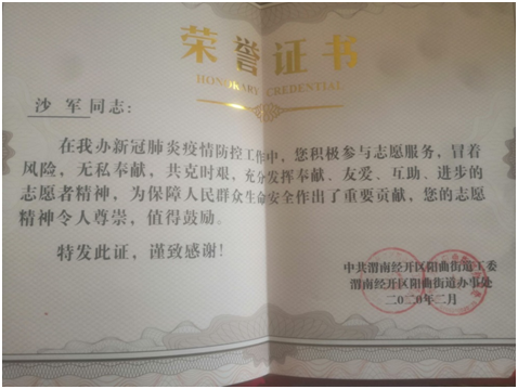 近日,化學(xué)化工學(xué)院收到一封特殊的來信,函件來自中共渭南市經(jīng)開區(qū)陽曲街道工委,對(duì)化工研1801班沙軍同學(xué)在當(dāng)?shù)匾咔榉揽毓ぷ髦凶龀龅呢暙I(xiàn)提出褒揚(yáng),并感謝學(xué)校對(duì)人才的培養(yǎng)。表揚(yáng)信中說,沙軍同學(xué)主動(dòng)請(qǐng)纓加入當(dāng)?shù)乜挂呦蠕h志愿服務(wù)隊(duì)在工作中積極作為、吃苦耐勞、表現(xiàn)積極,充分展現(xiàn)了新時(shí)代青年大學(xué)生的風(fēng)采,當(dāng)?shù)亟值拦の?/span>對(duì)沙軍同學(xué)等優(yōu)秀志愿者進(jìn)行了榮譽(yù)表彰。據(jù)了解,1月底開始,沙軍同學(xué)就一直志愿工作在當(dāng)?shù)氐囊咔榉揽貞?yīng)急分隊(duì),承擔(dān)起對(duì)進(jìn)出人員及車輛進(jìn)行登記、消毒、宣傳等疫情防控工作。他表示:疫情暴發(fā)時(shí),黨和國家立即組織力量投入到救治防控中,每次在抖音上看到新聞時(shí),我都十分動(dòng)。就我們村而言,有人捐款捐物資,有人義務(wù)消毒滅殺細(xì)菌,也有人上門講解國家防控政策。就我個(gè)人而言,也是渴望著能為這疫情防控做一點(diǎn)貢獻(xiàn),所以我主動(dòng)報(bào)名加入到我們村的志愿服務(wù)活動(dòng)中,為家鄉(xiāng)的疫情防控工作奉獻(xiàn)自己微弱的力量。面對(duì)當(dāng)?shù)卣陌龘P(yáng),沙軍同學(xué)羞赧地表示他只是做了他認(rèn)為正確的事,今后他將化褒揚(yáng)為動(dòng)力,繼續(xù)做好志愿服務(wù),用實(shí)際行動(dòng)做出表率。