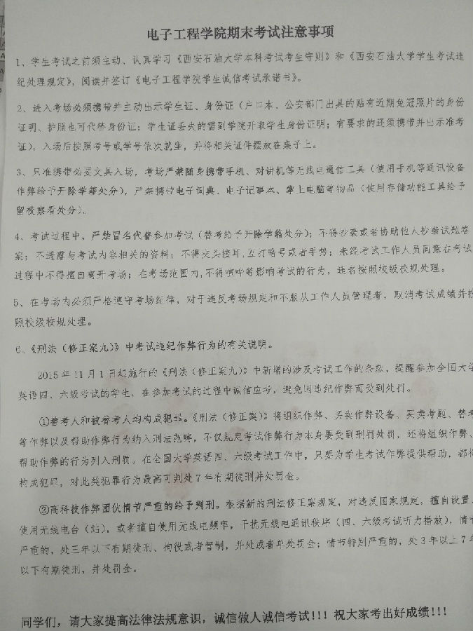 二是各年級結(jié)合實際情況,以專業(yè)為單位分別召開了誠實守信教育大會,輔導(dǎo)員老師結(jié)合PPT,帶領(lǐng)全體研究生同學(xué)學(xué)習(xí)了《西安石油大學(xué)研究生手冊》中《國家教育考試違規(guī)處理辦法》和《西安石油大學(xué)學(xué)生(研究生)考試違紀(jì)處理規(guī)定》,以及 2015年11月1日起施行的《刑法(修正案九)》中新增涉及考試工作的條款,提醒同學(xué)們在參加各類考試的過程中要嚴(yán)格做到誠信應(yīng)考,避免因違紀(jì)作弊而受到處罰。