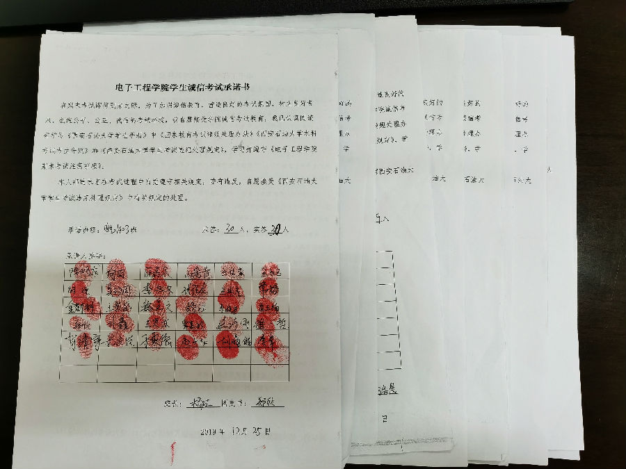 本次專業(yè)大會由19級輔導員沈軒羽老師主持,各專業(yè)班委共同組織完成?;顒娱_始前,主持人宣讀《西安石油大學本科考試考生守則》及我校學生考試違紀處理規(guī)定,帶領大家學習《電子工程學院各類考試注意事項》并圍繞“誠信教育”主題,將說理和例證相結合,逐步深入,向同學們說明認真?zhèn)淇?,誠信參考的重要性。隨后是班干部組織同學討論環(huán)節(jié),各專業(yè)同學積極參與討論,各抒己見,表達對認真?zhèn)淇?,誠信參考的看法以及做出了相關承諾并確認簽字。最后,各專業(yè)班長與團支書分別闡述了自己對推進良好學風考風必要性的個人見解及建議,并對本次班會進行總結,希望同學們在考試過程中,不要抱有僥幸心理,與考試無關的物品請勿帶進考場,不要讓監(jiān)考老師誤會,給自己帶來不必要的麻煩。