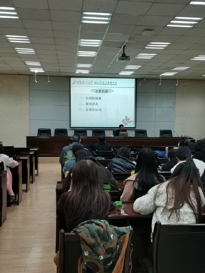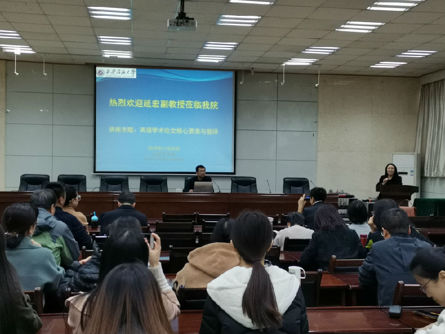 2019年11月20日下午15:00,在我校雁塔校區(qū)會(huì)議中心第三會(huì)議室,全國(guó)知名科技英語(yǔ)專家,西安理工大學(xué)科技英語(yǔ)翻譯研究所副所長(zhǎng)延宏教授應(yīng)邀做了題為《英語(yǔ)學(xué)術(shù)論文語(yǔ)言核心要素與翻譯》的學(xué)術(shù)報(bào)告。外國(guó)語(yǔ)學(xué)院教師和研究生參加了此次報(bào)告,報(bào)告由外國(guó)語(yǔ)學(xué)院副院長(zhǎng)劉輝主持。