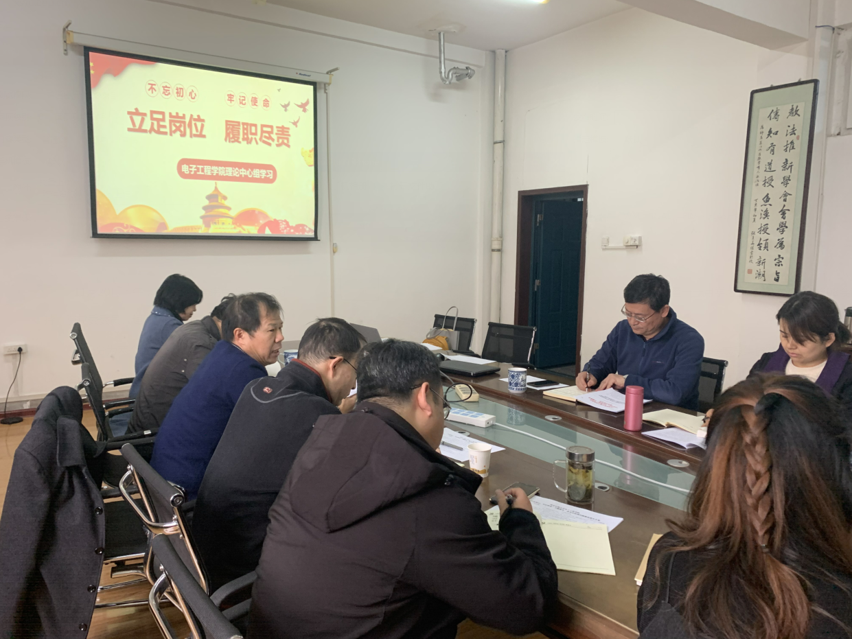 11月20日下午,電子工程學院黨委“不忘初心、牢記使命”主題教育學習教育第六個專題“立足崗位、履職盡責”專題學習暨十一月學習研討在1號教學樓908會議室舉行,會議由學院黨委書記何鋮同志主持,院黨委委員、理論中心組成員、各教工黨支部書記、教研室主任參加了會議。