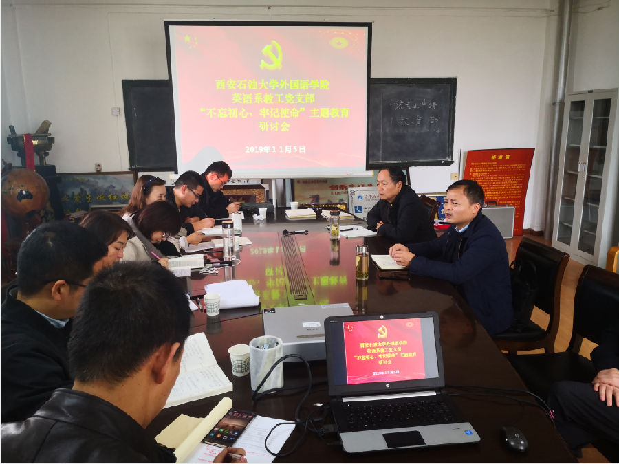 11月5日下午,外國(guó)語學(xué)院英語系教工黨支部在雁塔校區(qū)第一教學(xué)樓701會(huì)議室開展了支部書記講黨課學(xué)習(xí)活動(dòng)暨“不忘初心、牢記使命”專題教育研討會(huì),研討會(huì)由外國(guó)語學(xué)院副院長(zhǎng)、英語系黨支部書記陳武主持。
