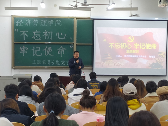 根據(jù)學(xué)校相關(guān)文件精神和學(xué)院“不忘初心、牢記使命”主題教育工作安排,10月25日下午,經(jīng)濟(jì)管理學(xué)院在鄠邑校區(qū)B區(qū)教學(xué)樓112室召開全體學(xué)生黨員大會。學(xué)院黨委副書記趙海濤出席會議并講授黨課,學(xué)院本科生以及研究生黨員近200人參加。